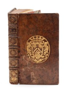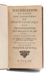 RELIURE AUX ARMES.— Pasquier QUESNEL. Justification du droit des chapitres de l'Église catholique des Provinces-Unis… [Paris], 1720. In‑12, 9 x 16,5 cm, XLIVpp., 1 f., 288pp., reliure de l'époque en basane fauve, armes dorées au centre des plats, dos à nerfs orné de motifs dorés. Édition originale. Exemplaire aux armes de Jean Delpech, 2e marquis de Méréville (1671-1737), conseiller au parlement de Paris (OHR 392). De la bibliothèque et Nepveu. Déchirure page 15 avec perte de texte. Deux cahiers légèrement brunis. Rousseurs et pâles mouillures angulaires. Plats frottés, mors fendus, accidents aux coiffes.
