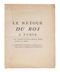 ROY (Pierre-Charles). Le retour du roi à Paris. Paris, Imprimerie de Pierre-Gilles Le Mercier, [1744]. In‑4, 23 x 28 cm, 1 f., 4pp., 1 f. blanc, broché. Livret d'une pièce lyrique sur le retour triomphal dans la capitale de Louis XV, après la campagne victorieuse des Flandres et sa maladie à Metz. Bandeau allégorique, cul-de-lampe et lettrine, gravés. Le poète Roy (1683-1764), élu à l'Académie des inscriptions et belles-lettres en 1729, fut secrétaire de l'ordre de Saint-Michel dont il avait été le premier homme de lettres à être décoré. La musique qui devait accompagner ce texte fut confiée à Jean-Ferry Rebel et François Francœur, surintendants de la chambre du roi. Très bon exemplaire débroché.