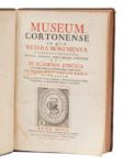 VALESIO (Francesco), Antonio Francesco GORI & Ridolfino VENUTI. Museum Cortonense, in quo vetera monumenta comprehenduntur anaglypha, thoreumata, gemmae inscalptae, insculptaeque, quae in Academia etrusca… Rome, GiovanniSalmoni, 1750. In‑folio, 22 x 33 cm, XVIII + 126pp., 85pl., reliure de l'époque en veau fauve moucheté, dos à nerfs orné de motifs dorés. Édition originale illustrée de vignettes et de 85 planches gravées d'antiquités étrusques du musée de Cortone. Lettrines gravées sur bois. De la bibliothèque Casati. Légères rousseurs. Petite découpe en marge d'une planche (pl. 79). Reliure frottée. Accident à la coiffe supérieure. Pièce de titre manquante.
