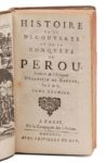 ZARATE (Agustín de). Histoire de la découverte et de la conquête du Pérou. Paris, La Compagnie des libraires, 1716. 2 vol. in‑12, 9,5 x 16,5 cm, 20ff., 360pp., frontispice et 14 planches, dont 3 repliées & 4ff., 520pp. (mal chiffrées 480), reliure de l'époque en veau fauve, dos à nerfs ornés de motifs dorés. L'illustration gravée comprend un frontispice, une carte repliée et 13 planches, dont 2 repliées. Mouillures anciennes. Coiffes et coins frottés.