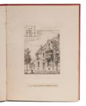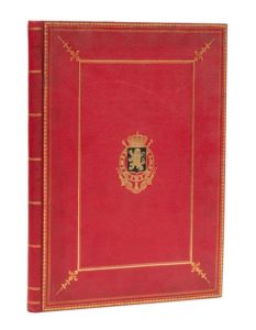 Ancien atelier Portaels. Exposition de peinture, sculpture, architecture. Catalogue 1883. Bruxelles, A. Deswarte, [1883]. In‑4, 23,5 x 31,5 cm, 27ff., titre-frontispice et 23pl., cartonnage à la Bradel de l'époque en percaline rouge, double encadrement doré à la Du Seuil sur les plats, armes dorées mosaïquées de chagrin noir au centre du premier plat, monogramme couronné doré au centre du second plat, tête dorée. Édition originale du catalogue d'exposition des œuvres d'artistes ayant fréquenté l'atelier du peintre Portaels à Bruxelles, impasse Sainte-Apolline. L'illustration gravée comprend un titre-frontispice et 23 planches. Beau cartonnage aux armes du royaume de Belgique.