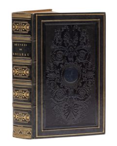 BOILEAU DESPRÉAUX (Nicolas). OEuvres… avec les commentaires revus, corrigés et augmentés par M. Viollet le Duc. Paris, Th. Desoer, 1823. In‑8, 14,5 x 23 cm, 2ff., IV + 494pp., frontispice et 6pl., reliure de l'époque, signée Thouvenin, en veau bleu nuit, double encadrement doré et plaque à froid sur les plats, dos à nerfs orné de motifs et de filets dorés, roulette dorée aux coupes, dentelle intérieure dorée, tranches dorées. Édition annotée par Emmanuel Viollet-le-Duc, père de l'architecte, qui possédait une célèbre bibliothèque poétique. Illustré d'un portrait gravé en frontispice et de 6 planches gravées. Très belle reliure romantique de Thouvenin. Feuillets brunis, rousseurs. Relié avec : Mathurin REGNIER. OEuvres… avec les commentaires revus, corrigés et augmentés ; précédées de l'histoire de la satire en France… par M. Viollet le Duc. Paris, Th. Desoer, 1823. 2ff., XII + 96pp., 1 f.