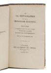 CHATEAUBRIAND (François-René de). Réunion de 3 ouvrages en un vol. in‑8, 12 x 20,5 cm, reliure de la seconde moitié du xixe siècle en demi-basane bleue, dos orné de faux-nerfs dorés. Intéressant recueil des éditions originales de textes de Chateaubriand défendant les Bourbons exilés ou emprisonnés par la Monarchie de Juillet. Très bon exemplaire, de la bibliothèque de Casimir de la Lauzière (1795-1867), au Beausset (Var), garde de la porte du roi sous la Restauration (signature et étiquette typographique). Chiffre de tomaison doré au dos. Rares piqûres. Détail : • De la restauration et de la monarchie élective, ou Réponse à l'interpellation de quelques journaux sur mon refus de servir le nouveau gouvernement. Paris, Le Normant fils, 24 mars 1831. 48pp. • De la nouvelle proposition relative au bannissement de Charles X et de sa famille ou Suite de mon dernier écrit : De la restauration et de la monarchie élective. Paris, Le Normant fils, octobre 1831. 156pp., 2ff. • Mémoire sur la captivité de madame la duchesse de Berry. Paris, Le Normant, décembre 1832. 122pp., 3ff. Relié avec : [Eugène-François-Auguste d'ARNAUD DE VITROLLES]. Note secrette exposant les prétextes et le but de la dernière conspiration. Paris, Foulon, Delaunay et Pélicier, Eymery, 1818. 58pp., 1 f. blanc. Une lettre imprimée de Chateaubriand, découpée dans le Constitutionnel, a été montée sur le faux-titre taché par la colle, ainsi que le titre.
