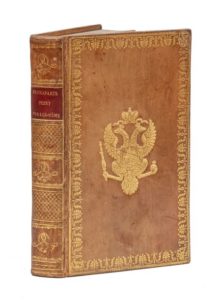 [COFFINIÈRES (Antoine)]. Buonaparte peint par lui-même dans sa carrière militaire et politique… Paris, Belin‑Le Prieur, 1814. In‑8, 12 x 20 cm, 2ff., VIII + 534pp., reliure de l'époque en veau blond, roulette à froid et double filet doré en encadrement avec armes au centre des plats, dos orné de faux-nerfs et de motifs dorés, roulette dorée aux coupes, tranches dorées. Édition originale. Le légitimiste Coffinières (1786-1862), docteur en droit, était avocat à Paris. Bel exemplaire aux armes impériales de Russie. Ex-libris J. D. avec devise Semper audere. De la bibliothèque Nepveu. Rousseurs.