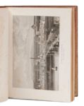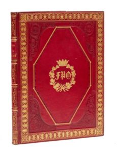 Collection de vues de Paris prises au daguerréotype. Gravures en taille douce sur acier par Chamouin. [Paris, Chamouin], vers 1850. In‑4, 22 x 29 cm, 1 f., 25pl., reliure de l'époque en maroquin à grains longs cerise, larges encadrements de dentelle et filets dorés et à froid avec chiffre couronné doré au centre des plats, dos à nerfs orné de motifs dorés, décor doré aux angles des coupes, roulette intérieure dorée, tranches dorées, doublures et gardes de moire bleu ciel. Album peu courant de vues de Paris, Versailles et Saint-Cloud, gravées au burin par Jean-Baptiste Chamouin (né en 1768). Très bel exemplaire au chiffre couronné du duc d'Orléans, fils aîné du roi Louis-Philippe (OHR 2580, fer 6). De la bibliothèque Nepveu. Quelques rousseurs marginales, importantes sur les serpentes.