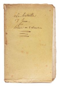 [DAVID (Pierre)]. La bataille d'Iéna, poëme en trois chants. Paris, Hocquet, octobre 1808. In‑8, 14,5 x 21,5 cm, 34pp., 1 f. blanc, broché, non rogné. Édition originale. Auteur dramatique, David (1772-1846) était alors consul en Bosnie. Bon exemplaire dans sa condition de parution. Titre manuscrit de l'époque sur la couverture muette.