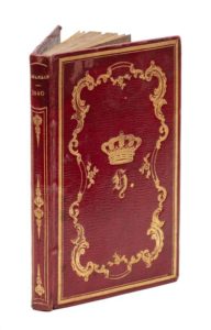 [HENRICHS (P.)]. Almanach-manuel pour 1840. 2e année… Paris, D'Urtubie, [1839]. In‑12, 8,5 x 13 cm, reliure de l'époque en maroquin à grains longs rouge, double encadrement de filets dorés, volutes et chiffre couronné dorés sur les plats, dos lisse orné de filets et de motifs dorés, tranches dorées. Édition originale de cette deuxième année. Charmant almanach pour 1840 présentant la maison du roi Louis-Philippe. Illustré de quelques bois gravés. Bel exemplaire au chiffre H couronné. Grand-Carteret 2229.