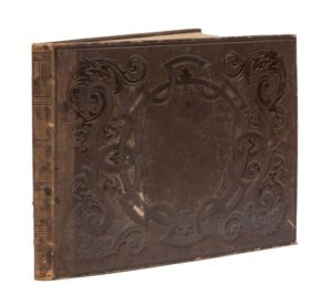 ITALIE.— Album de 56 estampes aquarellées de paysages et de monuments. Vers 1840. In‑8 oblong, 31 x 21 cm, 1 f. blanc, 57ff., reliure de l'époque en chagrin noir, large décor à froid sur les plats, dos orné de faux-nerfs à froid, tranches dorées. Réunion de 48 vues de Rome gravées sur métal (12 x 7,5 cm) entièrement aquarellées avec large bordure peinte, de 6 lithographies en noir (monuments d'Italie) (12,5 x 8 cm) entièrement aquarellées et gommées, et d'une lithographie en noir (port de la Joliette) (18 x 11,5 cm), chacune avec le titre à l'encre brune en dessous et montées. In fine sont montées 2 lithographies (23,5 x 18 cm) humoristiques aquarellées de Gatti et Dura à Naples : Salita al Vesuvio et Discesa dal Vesuvio. Quelques feuillets brunis. Piqûres marginales. Reliure légèrement frottée.