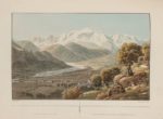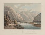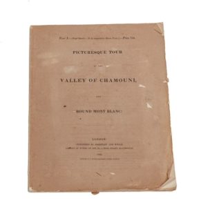 [RAOUL-ROCHETTE (Désiré)]. Picturesque tour in the Valley of Chamouni, and round Mont Blanc. Londres, Priestley and Weale, 1825. In‑4, 24,5 x 31 cm, 4ff., 4pl., broché. Édition originale, premier tirage. Belle suite de 4 planches gravées à l'aquatinte en noir d'après le peintre suisse Mathias Gabriel Lory fils (1784-1846), et finement aquarellées, avec texte explicatif, représentant des vues des environs de Chamonix et du Mont-Blanc : Vue du Valais prise de la Forclaz, Vallée de Maglan, Source de l'Arveiron, Vue du Mont-Blanc et de la vallée de Sallenche. Ces planches sont gravées par Frédéric Salathé ou Sigismond Himely. Une seule seconde livraison a été publiée la même année sur les onze prévues par l'éditeur. L'ouvrage complet a été publié en français à Paris l'année suivante. Très beau tirage sans rousseurs. Petits manques à la couverture.