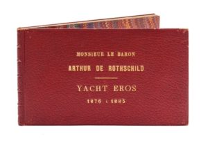 ROTHSCHILD.— Yacht Eros. Campagne de 1876 [-1885]… [Paris, 1885]. In‑12 oblong, 18,5 x 11 cm, 72pp., reliure souple de l'époque en maroquin rouge, filet à froid en encadrement sur les plats, dos à nerfs muet, inscription dorée Monsieur le baron Arthur de Rothschild. Yacht Eros. 1876 à 1885 au centre du premier plat. Très rare livre de bord entièrement lithographié du superbe yacht Eros I que le baron Arthur de Rothschild (1851-1903) avait commandé aux chantiers Lobnitz, Coulborn & Co. à Renfrew en Écosse et qu'il conserva jusqu'en 1887. Tous les voyages sont détaillés au jour le jour, de son armement à Boulogne-sur-Mer le 12 mai 1876 à son désarmement au Havre le 29 août 1885 : Gibraltar, Marseille, Constantinople, Naples, Le Pirée, Fécamp, Londres, Cowes, Barcelone, Valence, Carthagène, Tanger, Cadix, Anvers, Rotterdam, Bône, Alger, île de Wight, Villefranche, Monaco, Nice, Malte, Pauillac, Lisbonne, Venise, Alméria, Jersey, Trouville, etc. Luxueuse impression à très petit nombre pour le baron Arthur de Rothschild et ses invités sur ce yacht. Coiffes et coins légèrement frottés.