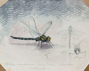 ENTOMOLOGIE. Dessin original (plume, aquarelle et crayon), légendé. 14 x 18 cm. Coins coupés. XIXe. Beau dessin d'une libellule, à l'aquarelle, avec cette légende : « Aeschna maculatissima (aeschne tachetée) grandeur nature ». Sur le côté, deux croquis du même insecte, au crayon (vue de dessus et vue de face).
