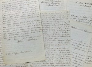 [Isidore GEOFFROY SAINT-HILAIRE]. Catherine (ou Kate) McKEAN, femme de sciences américaine ; elle travailla au Jardin des Plantes de Paris et fut en relation avec les savants français comme Geoffroy Saint-Hilaire ou Constant Duméril ; elle fut aussi une collaboratrice d'Henry Charles Carey (1793-1879). 6 lettres autographes signées à Isidore Geoffroy Saint-Hilaire, 23 pp. in-8. Paris, Londres, Philadelphie et Baltimore, 1860-1861. Sur la situation en Amérique au moment de l'élection d'Abraham Lincoln et sur sa traduction et sa tentative d'édition aux États-Unis des travaux de Geoffroy Saint-Hilaire. Elle raconte son voyage dans l'Europe du sud puis son retour aux Etats-Unis où elle tente de faire éditer ses traductions de travaux de Geoffroy Saint-Hilaire. Puis évoque le climat politiques qui règne en Amérique au moment des élections présidentielles qui verront la victoire d'Abraham Lincoln. « Cette élection n'a jamais été d'une plus grande importance parce qu'il s'agit d'un changement complet de notre politique, changement qui ne deviendra possible qu'en secouant le joug d'une partie qui, malgré son nom de « Democrat » est celui de l'esclavage. Sans doute vous mettez un faible intérêt à nos luttes de politique, mais moi, je les tiens d'une portée immense, non seulement pour nous, par réflexion pour le monde entier […] ». Elle joint deux listes de questions, demandant des précisions, afin de terminer sa traduction : « […] 410. Sa démission, en 1841. Est-ce vous qui l'avez remplacé ? Ces deux chaires de la Faculté des sciences et du Muséum, n'ont-ils jamais été occupés que par votre père et par vous ? […] ». Après l'élection de Lincoln, la tension est plus vive que jamais dans le pays. « Vous connaissez, sans doute, la position menaçante où nous sommes actuellement dans ce pays, à la veille, à ce qu'il paraît, d'une révolution, dont l'attente paralyse tout, et affecte les intérêts de tout le monde. Il y a suspension presque complète de l'action et du mouvement social, chacun se félicitant s'il peut vivre au jour le jour. Dieu seul sait ce qui en sera le résultat, cependant j'ai beaucoup de foi dans le peuple et dans les institutions républicaines, et je ne vois plus les choses tout en noir que beaucoup de monde. Presque tous nos maux se résument dans la question brûlante de l'esclavage […]. Croyez que je revisite souvent, par la pensée, ce Jardin des plantes qui a tant d'intérêt pour moi et que je voudrais pouvoir un jour revisiter en personne. Je vois, à grand regret, que vous avez perdu le vénérable M. Duméril. Encore un anneau rompu avec cette génération qui a vu et fait de si grandes choses […]. Aux vacances de Noël, ayant quelques heures à ma disposition, je les ai passées à parcourir les planches du grand ouvrage sur l'Égypte […]. Je serai très contente de recevoir l'exemplaire de votre nouvel ouvrage sur l'acclimatation des animaux […]. J'ai envoyé au Journal Américain de la Science votre petit article sur l'Espèce, mais je n'ai pas encore eu de réponse décisive ; on a tant de contributeurs que bien souvent il faut attendre quelques mois pour qu'on y fasse attention. M. Agassiz est l'associé en zoologie de ce journal […] ».