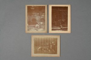 [MUSEUM D'HISTOIRE NATURELLE]. Ensemble de 3 photographies de la ménagerie du jardin des Plantes. 12,4 x 9,4 cm et 9,3 x 12,3 cm, contrecollées sur carton. Début du XXe siècle. Deux photographies représentent deux lionnes en cage, l'une couchée, l'autre debout, vues de près, dont une semble accompagnée d'un chien. Le troisième cliché figure deux ours polaires, dans la fosse aux ours blancs.