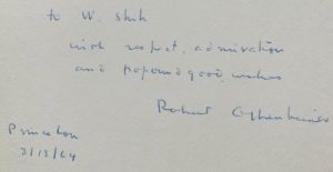 Robert OPPENHEIMER (1904-1967), physicien américain, père de la bombe A. Pièce autographe signée sur un feuillet in-4, contenu dans un classeur américain de l'époque, contenant également d'autres feuillets autographes. Témoignage d'admiration au mathématicien Shih Wei-Shu (Beijing 1931-1998), membre de l'Institute for Advanced Study de Princeton, qui travailla sur la topologie et les équations aux dérivées partielles. « To W. Shih, with respect, admiration and profound good wishes. Robert Oppenheimer. Princeton 3/13/64 ». Sur d'autres feuillets du classeur, d'autres grands physiciens et mathématiciens ont également écrit quelques mots en témoignage d'admiration. - Saunders MACLANE (1909-2005), mathématicien américain, cofondateur de la théorie des catégories. Texte autographe signé : « To my good friend Weishu Shih, in appreciation of his many stimulating ideas, in topology, in homological algebra, and in categories, and with my very best wishes for the success of his work in the future ». - Marston MORSE (1892-1977), auteur de la Théorie de Morse sur le calcul des variations. Texte dactylographié signé : « Dear Dr Shih, It was a good fortune to come to know you recently. Your broad interest in mathematics includes subjects as diverse as differential geometry, topology and celestial mechanics. I hope that we may be able to work together sometime in the future. Whether or not you are my assistant this will be an honor and an inspiration ». - André WEIL (1906-1998), mathématicien, membre fondateur du groupe Bourbaki, connu pour son travail sur la Théorie des Nombres. Texte autographe signé : « Les mathématiques sont comme le cochon, tout en est bon » (Lagrange). À M. Shih Wei-Shu en témoignage de mes sentiments cordiaux. A. Weil. Princeton, le 3 mars 1964 ». Figure également une signature autographe de John W. MILNOR (né en 1931).
