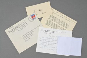 PRIX NOBEL. 3 pièces. Max von LAUE (signature avec date et lieu au dos de sa carte de visite), Alfred KASTLER (note autographe sur sa carte). Louis NÉEL (C.A.S.)