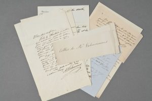 Achille VALENCIENNES (1794-1865), zoologiste. 6 lettres autographes signées au chimiste Edmond Frémy (1814-1894), professeur au Muséum. 6 pp. in-8 et in-16, dont 2 à en-tête du Muséum (une lettre avec un billet autographe signé de Constant DUMÉRIL à Frémy, épinglé). Paris, 1853 et s.d. Adresses au dos. Intéressante correspondance. « Voilà le Fuchsia en arbre, qui rivalisera peut-être un jour avec votre cèdre du Liban que Mde Valenciennes & moi avons grand plaisir à offrir à Mde Frémy. Faites-le mettre en terre, il en sera bientôt tout rouge, non de honte mais de fleurs. Berger qui l'a arrangé de manière à en rendre le transport commode, m'apprend que si vous vouliez avoir le Fuchsia à grandes feuilles et à fleurs allongées, il en connaît des individus très beaux à haute tige qu'il pourrait facilement vous procurer ». Au sujet de l'annuaire des eaux et forêts dont il pense qu'il intéresserait Humboldt. Il lui transmet des chiffres au sujet des études de Hattchett sur la nacre irisée : « Si Hattchett s'est trompé, rectifiez-le, ce sera utile. Ce sont les restes de ce que j'apprenais par mes causeries avec Humboldt et Arago à l'Observatoire du temps d'Abraham ou de Noé !! ». Au sujet d'un changement à la direction du Muséum. « Quelqu'un sort de chez moi et m'a dit : « Je quitte M. G. qui vient de m'apprendre le grand changement du Muséum ; le Prince de Canino m'a fait lire le décret qui le nomme directeur du Muséum ». Est-ce que vous en avez appris quelque chose ? ». Enfin, une lettre très sévère concernant peut-être Alcide d'Orbigny [qui fut nommé professeur au Muséum en 1853], sur laquelle est épinglée le billet de Constant Duméril le prévenant qu'ils sont convoqués chez le ministre : « Comme j'ai quelquefois témoigné, en termes assez vifs, le peu de valeur de l'homme qui nous a été donné pour collègue, je joins ici une simple notice publiée par M. d'Orbigny pour vous faire le genre d'éducation et d'instruction qu'il a reçues, et l'impertinence de ce monsieur qui n'avait certes pas besoin d'écrire en langue étrangère, quoique classique de pareilles fautes, solécismes et barbarismes y abondent. Partout du latin du médecin malgré lui ou du malade imaginaire. Voyés les mêmes barbarismes répétés pag. 33, pag. 42, pag. 43. Sans en compter ou signaler beaucoup d'autres. C'est imprimé, il n'y a pas moyen de se dédire ».