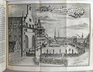 Une des nombreuses éditions de ce livre de topographie réédité durant tout le cours du XVI11e siècle. Celle-ci est illustrée de 4 frontispices, 1 carte générale et 139 hors-texte gravés par Jacob Harrewijn figurant des plans de villes ou des vues d'architectures civiles et ecclésiastiques reprises à des ouvrages plus anciens comme les "Délices de Leiden", Sanderus ou Le Roy. On y trouve aussi les listes chronologiques par province des souverains, gouverneurs, fonctionnaires, ecclésiastiques, etc. # de le Court p. 312. ▲ Provenance : Bélesta (?) (d'argent plain, au chef bandé de gueules et d'argent).