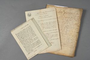 ALPES-MARITIMES. 3 documents XVIe-XVIIIe concernant Grasse. - Cahier de parchemin de 20 pp., 33 x 24 cm. Succession grevée de dettes d'un bourgeois de la ville de Grasse. 1598. - 2 lettres circulaires imprimées avec signatures autographes, avril et décembre 1789, la première par l'intendant de Provence. Sur les secours en blés accordés aux communautés, à cause de la disette et des rigueurs du climat, et invitant les sociétés patriotiques à aider les pauvres, l'état des finances de l'État ne le permettant plus. On joint un extrait des registres d'état civil (1801).