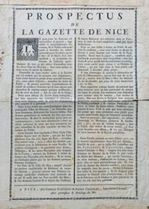 ALPES-MARITIMES. Affichette imprimée à Nice, chez Gabriel Floteront et Pierre Cheisolme, imprimeurs-librairies. [1772]. Collages au dos et dans les marges, petite déchirure au pli central. Rare « prospectus de la Gazette de Nice », annonçant la parution de ce périodique fondé en 1772 par Pierre-Joseph Cheisolme (1718-1792), réfugié à Nice, et qui fut supprimé en 1774 ou 1775.
