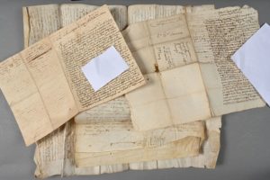 ARDÈCHE. 3 documents du XVIe et 1 du XVIIIe. - Lettre à l'évêque de Viviers, 1760. 3 pp. in-4. Copie d'époque de la lettre-supplique des consuls de la ville du Bourg-Saint-Andéol à l'évêque de Viviers, au sujet des droits de la communauté d'exercer la police. - Parchemin, 52 x 33 cm. 16 février 1551. Acte par lequel Louis de Bornes, seigneur de Laugières [Logères, paroisse de La Veyrune, Ardèche], permet à Benoit Brisson de Relothon, paroisse de la Verne, diocèse de Viviers, de faire une coupe de bois de futaie pour son chaussage, moyennant 10 livres tournois ». - Grand parchemin, 56 x 44 cm. 13 mai 1555. Vente de deux terres « assises au terroir du Flachey » [à Pailharès] par Claude Gachet, chapelier à Annonay. - Donation faite au notaire royal d'Annonay maître Guillaume Sozca par Catherine Sarrailliers d'Annonay, de tous ses biens « par amour qu'elle a envers luy ». Annonay, 1543.
