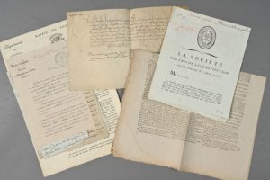 ARDENNES. 8 documents XVIIIe-XIXe. - Quittance signée par Charles Le Charron, receveur général des Finances en Champagne, pour la somme de 600 écus du receveur des tailles en l'élection de Rethel, Paul Du Rais. Chalons, 24 février 1600. - Exemplaire de la Gazette nationale du 22 prairial an 2 (4 pp. grand in-folio) annonçant la condamnation à mort de 27 citoyens de Sedan dont le maire et des officiers municipaux. - Lettre circulaire de la Société des amis de la Constitution (Sedan, 16 juin 1791) - Lettre circulaire du curé de Daigny (1869) pour la construction de l'église. - 3 lettres sur les événements révolutionnaires (Givet, Charlemont, 1792-1793) - Imprimé de la municipalité de Sedan relatif à la construction d'un monument à la mémoire de Turenne (1819).