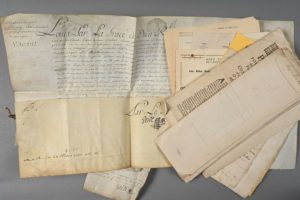 AVEYRON. Environ 25 documents XVIIe-XXe. - Liasse de 3 documents scellés dont un grand parchemin de 1734 : octroi de la charge de notaire royal à l'Encou, sénéchaussée de Villefranche-de-Rouergue. - Ensemble de 7 documents comptables concernant le Cercle littéraire de Rodez (1860-1880) - Factum imprimé du seigneur de Lhom contre les frères prêcheurs de Milhau (XVIIIe). - Manuscrit d'un religieux de Saint-Affrique, Bernard Costes, parti à Rome en 1788 et détaillant ses difficultés depuis son retour en France. 1 p. in-4 d'une écriture serrée. Vers 1792. - Reconnaissance féodale de Jean Montrosier, bourgeois de Millau, au commandeur de la commanderie de Millau (1661). - Reconnaissance de dette du comte et de la comtesse de Baradat, à l'évêque de Vabre (1695-1697) + supplique à M. François de La Valette Cornusson évêque de Vabre. - Mémoire manuscrit relatif à une nomination au diocèse de Vabre (1682). - Imprimé révolutionnaire sur la vente des biens d'émigrés. Rodez, 1793. - Dossier provenant des archives de l'aviateur Maurice Bellonte qui, le premier, en compagnie de Dieudonné Costes, traversa l'Atlantique d'est en ouest : 4 lettres du président et du vice-président de l'aéro-club de l'Aveyron + 3 doubles de réponse, relatives à une fête aérienne qui doit se tenir à Rodez, 1933-1934 + 1 télégramme. Brochure du programme de la « Grande fête aérienne » qui doit se tenir à Rodez le 24 juin 1934 avec représentation des figures et loopings que doivent exécuter Bellonte, Maryse Bastié, etc. Manuscrit autographe (brouillon très corrigé) du discours prononcé par Maurice Bellonte (3 pp. in-4, rédigé au dos de feuillets à en-tête du Grand Hôtel Broussy à Rodez).