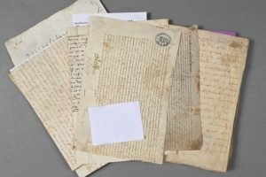 CALVADOS. 7 parchemins, XVe-XVIIe. - Parchemin de 1464 (tronqué côté droit). Bail passé en la vicomté de Vire. - Parchemin de 1481. Prise en fief à Authie. - Parchemin de 1524. Bail passé à Bayeux pour l'échange d'une vigne contre une terre. - Parchemin de 1586. Contrat pour le recouvrement de la taille à Pont-l'Évêque. - Parchemin de 1597 : bail à Thouvaille - Décision relative à un contrat de mariage passé à Orbec, 1619. - Important cahier en parchemin (70 pp., 27 x 23 cm) : adjudication faite en 1622 à Condé-sur-Noireau.