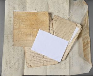 CHARENTE. 4 documents XVIe-XVIIIe - Principauté de Chabanais. Grand parchemin de 1543, 67 x 53 cm. Partage des biens de Guyon de Chasteauneuf, seigneur du Breuil de Chernes. Contrat établi par le garde du scel du prince de Chabannais. - Parchemin de 1667. Contrat d'échange aux Velluire-sur-Vendée (baronnie d'Oulme) - Manuscrit de 49 pp. in-folio. Récupération de hoirs à Montbron avec nombreux détails sur la famille de Marie de Cambertye. 1687. - Liasse de documents au sujet d'un procès tenu à Fenion au sujet du percement d'une source. 1789.