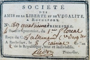 CHARENTE-MARITIME. Carte préimprimée, complétée et signée. Rochefort, 8 prairial an 2. 5,5 x 8 cm. Rare carte de la Société des Amis de la Liberté et de l'Égalité de Rochefort.