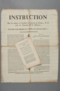 CHER. Affiche, imprimée à Bourges en 1791. 51 x 41 cm. « Instruction sur la culture & l'utilité de la graine de colza & de celle de navette d'été & d'Oliette, publiée par ordre du Conseil du département ». Il est joint une petite plaquette imprimée à Bourges en 1826 (8 pp. in-8) : « Avis aux propriétaires et cultivateurs. Projet de souscription ouverte par la Société d'Agriculture du Cher pour la destruction de la chenille des grains »