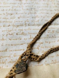 CORRÈZE. Parchemin, 34 x 28 cm, avec fragment d'un sceau (sur 3) en cire brune, pendant sur grande cordelette tressée (22 cm). Saint-Geniez-ô-Merle, 1271. Tours et forteresse de Merle. Litige entre d'une part Guillaume de Veyrac et d'autre part Guidon De Merle, Hugues De Merle, Pierre De Merle, fils et pupilles du défunt Raoul De Merle, au sujet des droits féodaux associés à la terre et à la forteresse de Merle en Limousin. Les De Merle étaient en effet coseigneurs du lieu, avec d'autres familles seigneuriales. Le litige intervient en Limousin sous domination anglaise, ce qui explique qu'il soit présenté devant le sénéchal du roi d'Angleterre.