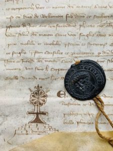 DRÔME. Parchemin scellé par un superbe sceau en plomb parfaitement conservé. Carpentras, 26 octobre 1356. 37,5 x 31 cm. Pierrelatte. Acte passé à Carpentras au sujet d'une maison en crotté située à Pierrelatte donnée en accapit ou emphytéose aux consuls et procureurs fondés de ce lieu, Pierre Bezut (ou Bezoul). Charte en partie transcrite au dos. Beau document.
