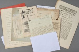 FINISTÈRE. 13 documents divers XVIIe-XIXe. - Imprimé : « À nosseigneurs des États de Bretagne, supplient très humblement les maire & échevins de la ville & communauté de Brest » (sur la ruine de l'hôpital de Brest, 2 pp. in-folio, vers 1765). - Parchemin de 1627. Dénombrement à Saint-Goazec. - Cahier manuscrit de 83 pp. in-4. Vente d'une maison aux enchères par licitation à Saint-Martin-des-Champs. Mai 1789. - Lettre de l'abbé de Rocquencourt chanoine de Quimper (1788, à un autre chanoine de Quimper). Lettre de Pierre Pezron à une demoiselle (1650). Prospectus de l'ouvrage Arvos par André Petitcolin. - 2 quittances du garde du pavillon amiral et d'un lieutenant de vaisseau de la compagnie de Tredern (Brest, 1748-1750, parchemins en partie imprimés). - lettre de l'Espine chevalier de Grainville (Morlaix, 1787) + pièce imprimée sur le « numérotage des maisons » à Morlaix (1811) - 3 manuscrits provenant des archives de l'aviateur Maurice Bellonte qui, le premier, en compagnie de Dieudonné Costes, traversa l'Atlantique d'est en ouest. 1928. Intéressants rapports sur les méthodes de navigation aérienne enseignées à Brest. « Exposé des méthodes de navigation aérienne enseignées au stage de Brest » (30 pp. in-folio), « Rapport sur les méthodes d'enseignement du cours de Brest » (7 pp. in-folio) et « Appareils de navigation » (9 pp. in-folio). Il est accompagné d'une lettre d'introduction signée du rapporteur, le pilote Gervais (2 pp. in-folio, datée de Chartres 28 juillet 1928). « Chargé par la compagnie Air Union de suivre le cours de navigation de Brest, nous avons résumé dans ces trois rapports ci-joints les enseignements qui nous ont été donnés […]. Nous avons une foi inébranlable dans la navigation. Nous ne demandons qu'à la communiquer à nos camarades et à faire toutes les expériences qui pourraient faire faire un pas à cette science nouvelle ». - Augustin LE GOAZRE DE KERVELEGAN (Quimper 1748/1825), constituant et conventionnel du Finistère, il fut également maire de Quimper. L.A.S. à « mon cher Bordas » et « vieux collègue » [probablement le conventionnel montagnard Pardoux Bordas]. 1 p. ½ in-4. Consolidation des bords au dos. « Toulgoat près Quimper, 15 thermidor an 11 ». « Il est écrit mon cher Bordas dans le 3e ciel de St Paul, où nous n'allons jamais, ni l'un ni l'autre, que du sein de mes bois et de mes montagnes du Finistère, j'étois destiné à te tourmenter […]. Une place de juge de paix est vacante dans mon voisinage : les habitants désirent le citoyen Jean Le Berre qui te verra à Paris. C'est un homme de mérite et de talent, il pourroit enseigner les grammaires françoise, latine, espagnole, mais ce qui lui sera utile dans la place […] c'est qu'il sait le celtique langue sans laquelle il est impossible d'être bon juge de paix dans nos cantons ruraux […] ». - Jacques-Tanguy-Marie GUERMEUR (Quimper 1750-1798), conventionnel du Finistère. L.A.S., 3 pp. in-4. Quimper, « 25e jour du premier mois de l'an 2 de la République une et indivisible ». Très intéressante lettre sur la violente répression qu'il mène dans le département. Il a été retenu à Brest par Jean Bon Saint-André et Prieur. « Ils n'auront pas manqué de vous dire que je les ai mis à peu près sur la voye de l'infâme conspiration qui a fait rentrer notre flotte […] ». Il a dû faire 2 voyages à Landernau car son administration était « entravée dans sa marche par un comité de surveillance que les intrigants étoient parvenus à composer des hommes pour le moins suspects, elle étoit entravée par une société muscadine qui rivalisoit avec celle sans culottes ». Il a fait exécuter à Quimper divers mandats d'arrêt. « Les plus coupables cependant, l'infernal Abgrall et La Hubaudière y ont échappé pour quelque tems et j'ai de violens soupçons que cela est venu du bureau même de vos collègues qui, je vous dois la vérité, avoient pris pour adjoint à la commission, un certain Belval ci devant procureur général sindic, celui qui a le plus contribué à soulever Brest, l'âme damnée du traitre Kervelegan […] ». On vient de lui apprendre qu'on avait tenté de l'arrêter mais qu'il est en fuite « ce qui est malheureux car il est atteint et convaincu d'énormes dilapidations ». A Landernau, il a appris qu'on avait vu Kervelegan « chasser avec 2 autres dans la palue de Penmarch ». Aussitôt il prit des mesures pour envoyer 30 hommes à sa recherche. « Ce qui fut exécuté, ils souillèrent deux châteaux et ne trouvèrent rien ». Il poursuit sa traque infernale. « Dès que j'appris l'arrestation du scélérat Souchet, de Keroisien, de la femme Kervelegan et de quelques autres, je crus devoir revenir de suite à Quimper, parce qu'actuellement j'ai tous les moyens nécessaires pour poursuivre ces scélérats. Arrivé avant hier dans la nuit, je m'entourai du chef de légion, de Vaucel qui se comporte on ne peut mieux