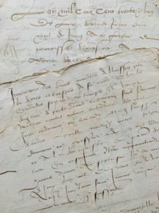 GIRONDE. 2 cahiers manuscrits formant 57 pp. in-4. Barsac, 14-30 juin 1531. Inventaire des biens, meubles, de Charles de Budos, écuyer, seigneur de Barsac (Gironde), réalisé par Adrien Rolland avocat en la cour de Parlement de Bordeaux. Dans la maison sise à côté du château, on trouve de nombreuses étoffes dont la liste est dressée. Multiples détails sur les habitudes de vie de ce seigneur et de sa famille.