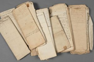 JURA. Liasse contenant d'une quarantaine de documents XVIIe-XVIIIe concernant la famille Andrey, chatelains de Binand. « Lettres de Bourgeoisie pour le Sr Jean Andrey [« juge et chastelain de Binand »] en la ville de Dole » (1683, parchemin, signatures). « Achapt de la charge et office de conseiller honoraire aux bailliage et présidial de Lons-le-Saunier pour Antoine Andrey avocat au parlement » (1713). Lettres de conseiller honoraire au bailliage et siège présidial de Lons-le-Saunier (parchemin, 1714). Lettres de Bourgeoisie en la ville de Lond-le-Saunier (1701, parchemin, signatures). « Interrogatoire du Sr Claude François Andrey » (1729, 26 pp. in-4). « Copie du testament du sieur Jean Andrey de Conliège, juge et chatelain de la baronnie de Binand » (1698, 34 pp. in-4). « Fondation d'ung service [de 3 messes] faicte par le sieur Andrey de Conliège juge de Buynand en l'église des Révérends pères cordeliers de Lons le Saunier » (1688), etc.