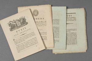 LOIR-ET-CHER. 6 imprimés révolutionnaires. « Éveil aux François » (Blois, imprimerie de la Société des Amis de la Constitution, 1792, 6 pp. in-4). « Discours du maire de la commune de Blois à M. Grégoire, évêque du département de Loir & Cher, lors de sa prestation de serment, en sa Paroisse Cathédrale, le dimanche 27 mars 1791 » (4 pp. in-4). Discours de l'évêque de Blois aux électeurs du département de Loir & Cher, du 11 février 1791 (Blois, imprimerie de J.P.J. Masson, 7 pp. in-4). « Discours prononcé par M. le lieutenant-général, l'un des quatre députés du Tiers-État, le 30 mars 1789, à l'assemblée des Trois-Ordres du bailliage de Blois » (imprimé à Blois, chez Masson, 4 pp. in-4). « Discours prononcé par M. le lieutenant-général du bailliage de Blois, le 22 mars 1789, à l'Assemblée du Tiers-État, au moment de passer au scrutin pour l'élection de quatre députés aux États-généraux » (imprimé à Blois, chez Masson, 4 pp. in-4). « Discours prononcé par M. le lieutenant-général, le 16 mars 1789, à l'Assemblée des Trois-Ordres du bailliage de Blois » (imprimé à Blois, chez Masson, 8 pp. in-4).