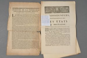 LOIRE-ATLANTIQUE. 4 imprimés XVIIe-XVIIIe. - « Statuts de la vénérable confrairie des prestres, deservie dans l'Eglise paroissiale de Saint-Jean de Montfaucon [diocèse de Nantes] » (4 pp. in-folio, imprimé à Nantes chez André Querro, 1740 ; déchirures et taches). - « À nosseigneurs des États de Bretagne, supplient humblement les députés de la ville & communauté de Nantes » (2 pp. in-folio, vers 1745). « À nosseigneurs des États de Bretagne » (remontrance des négociants et armateurs pour les vins de Nantes, 3 pp. in-folio, vers 1730). « À nosseigneurs des États de Bretagne » (supplique de Perrine Menil, femme d'un capitaine d'une barque de Redon qui après avoir ravitaillé Belle-Isle, a été pris par les Anglais et emmené en prison en Irlande ; 2 pp. in-folio fin XVIIe).