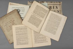 LOIRET. 8 imprimés et 6 affiches, XVIIe-XIXe. - Imprimés « Lettre au peuple d'Orléans sur ses vrais intérêts par un de ses plus sincères amis » (Orléans, 29 avril 1789, 2 pp. in-4). « Réponse à la lettre circulaire au Peuple d'Orléans sur les vrais intérêts, se disant un de ses plus sincères amis, datée du 29 avril 1789 » (Orléans, 5 mai 1789, 4 pp. in-4). « Arrest du Conseil d'Estat du Roy par lequel Sa Majesté a entr'autres choses maintenu & confirmé les notaires au châtelet d'Orléans […] » du 30 avril 1748 (8 pp. in-4). « Délibérations de l'assemblée générale de la ville d'Orléans tenue le 1er décembre 1788 concernant plusieurs objets relatifs à la convocation des États-généraux » (Orléans, 1788, 15 pp. in-4). « La soi-disant Dame de Douhault opposée à elle-même et réfutée par des actes authentiques, pour servir de réponse au mémoire qu'elle vient de pérandre contre MM. de Rogres de Luzignan de Champigneulles, de La Vergne de La Roncière, Guyon de Guercheville & Egrot du Lude » (Orléans, 15 floréal an 11, 64 pp. in-4). « Coupes de bois de l'ordinaire de 1836 à vendre à Orléans » (28 pp. in-4). « Factum pour Marie Tisonneau veufve d'Agnan Seurrat demeurant à Orléans […] » (XVIIe, 3 pp. in-4). « Arrest du Conseil d'État du Roy concernant les marchands d'eau de vie en gros de la ville & faux-bourgs d'Orléans (1688, 3 pp. in-4) - Affiches : « Aux habitants des départements de l'Aube, de l'Yonne et du Loiret » (Auxerre, 15 avril 1814). Adjudication de deux places de concierges fossoyeurs des cimetières d'Orléans (13 fructidor an 4, mouillures). « Grapillage des vignes » (Orléans 8 sept. 1819). « De par le Roy et son Altesse Sérénissime Monseigneur le duc d'Orléans » (ordonnant une assemblée ; Orléans 16 janvier 1741). « Marie d'Orléans - Transport des décombres, terres, gravois de démolitions & immondices de la ville » (2 avril 1817). « Distribution solennelle des prix de l'Institution nationale d'Orléans, le 20 août 1793 ».