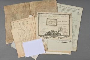 LOIRET. Plus d'une trentaine de documents, XVIe-XIXe. - Parchemin de 1560, 30 x 42 cm. Aveu de Jehan Petau à Jean de Boullehart seigneur de La Vallée - Beau diplôme de la Société Royale des Sciences, Belles-lettres & Arts d'Orléans (1823). Carte commerciale de madame Conte « marchande de modes » à Orléans (XVIIIe). Dépliant imprimé d'une composition musicale « Le héros de Mazagran » par C. Charpagne : don de l'auteur à la ville de Malesherbes au bénéfice de la souscription pour élever une statue au capitaine Lelièvre « vainqueur de Mazagran » (dédicacé par l'auteur). 1 lettre et 6 circulaires adressées à M. Bailly « prêtre chanoine de l'église collégiale de Saint-Pierre d'Orléans (1779). - Manuscrit d'un « Essai historique sur Saint-Germain-le-Grand » (15 pp. in-4). - une vingtaine de documents divers dont quittance signée par Louis Derancourt chanoine de l'église Saint-Etienne de Giens (1738), 3 lettres de Mgr Dupanloup à Sylvestre de Sacy, lettre circulaire des administrateurs du Loiret (an 4), lettre du bibliothécaire de la ville d'Orléans (1857), cartes d'électeurs, patente, certificat de comparution, lettre de Félix Pyat accompagnée d'une brochure « Le Solognot », etc. Loiret : voir également n°762