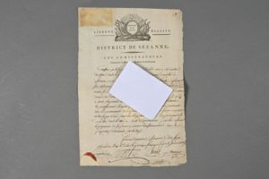 MARNE. Pièce signée par les administrateurs du directoire du district de Sézanne. 1 p. in-folio avec en-tête et vignette. Un coin jauni et un coin réparé. Sézanne, 17 messidor an 2. Certificat d'abdication du « citoyen Simon René David, ancien ministre du Culte dans la commune du Bricot, ci-devant domicilié à Sézanne […] ».