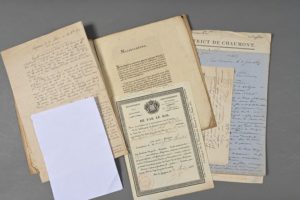 HAUTE-MARNE. 6 documents divers, XVIIIe-XIXe. - Imprimé : « Adresse à l'Assemblée Nationale, par la communauté des procureurs de Chaumont-en-Nassigny » (11 pp. in-4). - [Siège de Langres de 1870]. Manuscrit de 3 pp. in-folio. Copie d'époque de 5 « Rapports de la place [de Langres] » pour les journées des 30 et 31 décembre 170, à différentes heures. - Commission de garde-champêtre de la commune d'Esnoms (1838). Lettre (antisémite) d'un coutelier de Nogent-en-Bassigny (1896). Lettre commerciale à Danelle frères maître de forges au Buisson (1869). - Dossier de vente de domaines nationaux à Guindrecourt (1793).