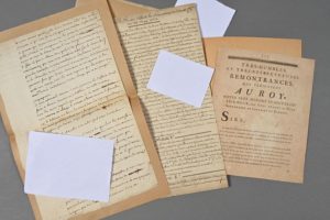 MEURTHE-ET-MOSELLE. 4 documents concernant la Cour des ducs de Lorraine, XVIIIe. - Manuscrit de 4 pp. in-folio (copie d'époque) : « Edit de Son A.R. qui defend la fréquentation des cabarets, du 28 may 1723 ». - Imprimé : « Très humbles et très respectueuses remontrances du Roy, notre très-honoré et souverain seigneur, les gens tenans sa cour souveraine de Lorraine et Barrois » (28 avril 1758). - Imprimé (page 7) : « Lettre de cachet à la Cour souveraine pour se rendre par députation à Lunéville » (Lunéville, 1758) - Manuscrit d'une main non identifiée (1 p. ½ in-folio, avec ratures et corrections). Récit d'une délégation qui souhaitait rencontrer le souverain lorrain [probablement le roi Stanislas], mais qui a été catégoriquement rejetée. « À nostre arrivée à Lunéville, nous sommes allé chez mr le chancellier à qui nous avons dit que nous venions supplier le roi de promettre que sa cour souveraine lui portât les remontrances qu'elle a adressées en conséquence de ses arrêtés du mois de septembre dernier au sujet de l'arrest du Conseil d'état du sept du même mois, et de fixer le jour et l'heure auxquels il lui plairoit recevoir ces remontrances […] ».