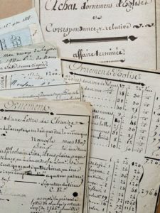 MEURTHE-ET-MOSELLE. Ensemble de 37 documents manuscrits, 1790-1823. Dossier sur le négoce d'ornements d'églises par les frères Gimé, négociants à Nancy et Pont-à-Mousson : lettres de curés, quittances, comptes, requête auprès du préfet de la Meurthe, lettres écrites entre les deux frères, comptes d'achat.
