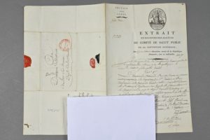MEUSE. Pièce signée par Lazare CARNOT, Robert LINDET et Claude-Antoine PRIEUR, 1 p. in-folio avec en-tête et vignette du Comité de Salut Public. Paris, 12 messidor an 2 [30 juin 1794]. Autorisation donnée au directoire de Bar-sur-Ornin « à mettre promptement à la disposition des citoyens Caunois et Béon, entrepreneurs de la fonderie de canons établie dans cette commune, les bâtimens et dépendances dans lesquelles elle se trouve située à la charge par eux d'en payer le loyer […] ».
