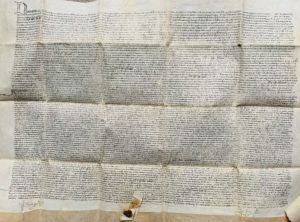 MEUSE & MEURTHE-ET-MOSELLE. Grand parchemin, 55 x 76 cm, scellé par un sceau en cire (à l'état de restes). Foug, janvier 1451. Quelques mots un peu effacés. Important document concernant l'abbaye de Rangeval. « Vidimus pour leglise de Rengievaulx [Rangeval] contre ceux de Bouch [Boucq] pour lez boix et aultres usages ». Longue procédure pour le « couvent et lesglise de rengievaulx » se terminant par un accord avec le seigneur de Boucq, impliquant également la prévôté et le château de Foug (« Fou »). Acte passé devant « Henry Perrin de Forcey clerc juré et garde du scel du tabellionage dudit Fou ». Le document cite également l'ancien compagnon de route de Jeanne d'Arc, « messire Robert de Bauldrecour » [Robert de BAUDRICOURT (mort en 1454), capitaine de Vaucouleurs, qui accorda une escorte à Jeanne d'Arc afin qu'elle puisse se rendre auprès du roi Charles VII à Chinon]. Beau document parfaitement calligraphié.