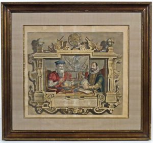 Importante estampe représentant le cartographe Mercator (1512-1594) et l'éditeur Hondius (1563-1612) assis dans un cabinet de travail avec une carte au mur, des livres, compas et globes sur la table devant eux. Large encadrement gravé, orné d'instruments géographiques légendé en latin. Jolie planche figurant dans de nombreuses éditions de la "Cosmographia" données à partir de 1623.
