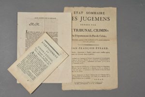 PAS-DE-CALAIS. 3 imprimés du XVIIIe. « Avertissement et observations sur l'analyse & l'usage de la terre végétative d'Étaples » (vers 1777, 12 pp. in-8). « Aux pères de famille » par Le groz de Marche (château de Beugnies, près Bapaume », 2 janvier 1788 » (4 pp. in-4) exposant son idée d'une « institution typographaire ou Éducation théorique ». Affichette : « État sommaire des jugemens rendus par le Tribunal criminel du département du Pas-de-Calais, séant à Saint-Omer, pendant le mois de messidor an 6 ».