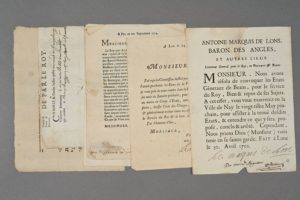 PYRÉNÉES-ATLANTIQUES. 8 documents concernant le Béarn. 2 lettres signées par le marquis de Lons, baron des Angles : convocation des États généraux de Béarn (1702 et 1776). 4 lettres circulaires du syndic général de Béarn et du trésorier des États, certaines signées (1704-1706). Laissez-passer pour un voiturier (Navarrenx, 1684). Avis au public (imprimé XVIIIe, concernant la seigneurie d'Arros).