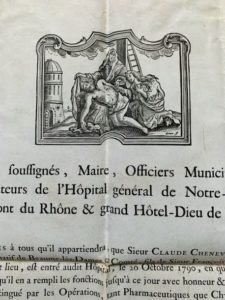 RHÔNE. 4 documents XVIIIe concernant l'Hôtel-Dieu de Lyon. - Grande pièce imprimée sur parchemin, avec très belle vignette gravée, portant les signatures autographes de 10 administrateurs de l'Hôpital général de Notre-Dame de Pitié du Pont du Rhône & grand Hôtel-Dieu de la ville de Lyon. 54 x 42 cm. Sceau sous papier. Certificat pour Claude Chenevière, élève en pharmacie, entré à l'hôpital le 20 octobre 1790, qui s'est « distingué par les opérations, tant pharmaceutiques que chymiques […] ». Lyon, 29 sept. 1792. Grand et spectaculaire document. - 2 quittances délivrées par les recteurs et administrateurs du Grand hôpital de Lyon (1731-1732). Documents pré-imprimés avec vignettes gravées, complétés et signés. - Certificat de naissance délivré par l'Hôpital général de la Charité (1775). Document pré-imprimé avec vignette gravée, compété et signé. On joint un certificat de décès délivré par l'Hôtel-Dieu de Lyon (1871)