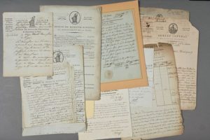 PARIS. Une vingtaine de pièces, quelques-uns avec vignettes. Documents concernant la Révolution à Paris. Lettres, attestations, certificats de civisme, etc. émanant de différentes autorités parisiennes (dont le Tribunal criminel, l'une signée par l'accusateur public), l'Agence du Domaine national (dont 5 sont signées « GUILLOTIN », homonyme de l'inventeur de la guillotine dont la signature est parfaitement identique…), vente de biens nationaux, etc.